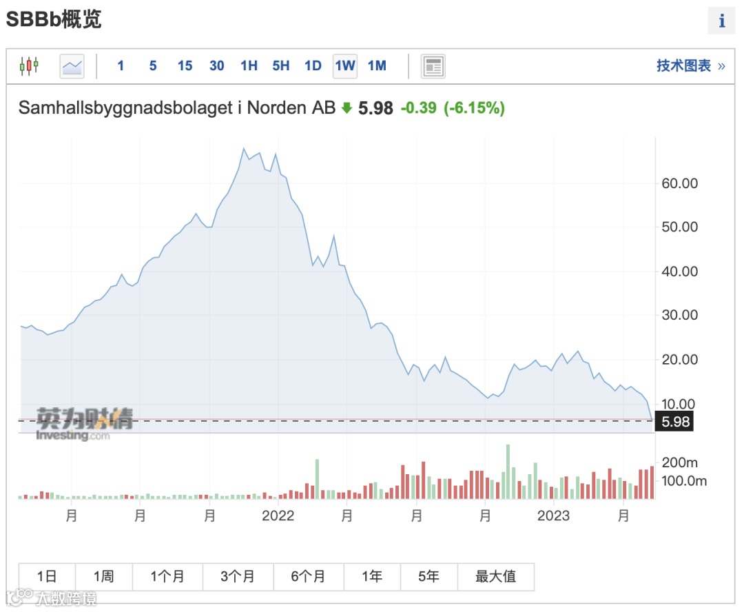 当地时间5月9日,瑞典最大的商业地产公司之一Samhallsbyggnadsbolaget i Norden AB(SBB)在欧洲股市暴跌超24%,跌至2018年以来的最低水平。5月10日开盘后,股价再度下挫,盘中跌幅一度超6%,使得SBB股价本周累计跌幅扩大至43%。
