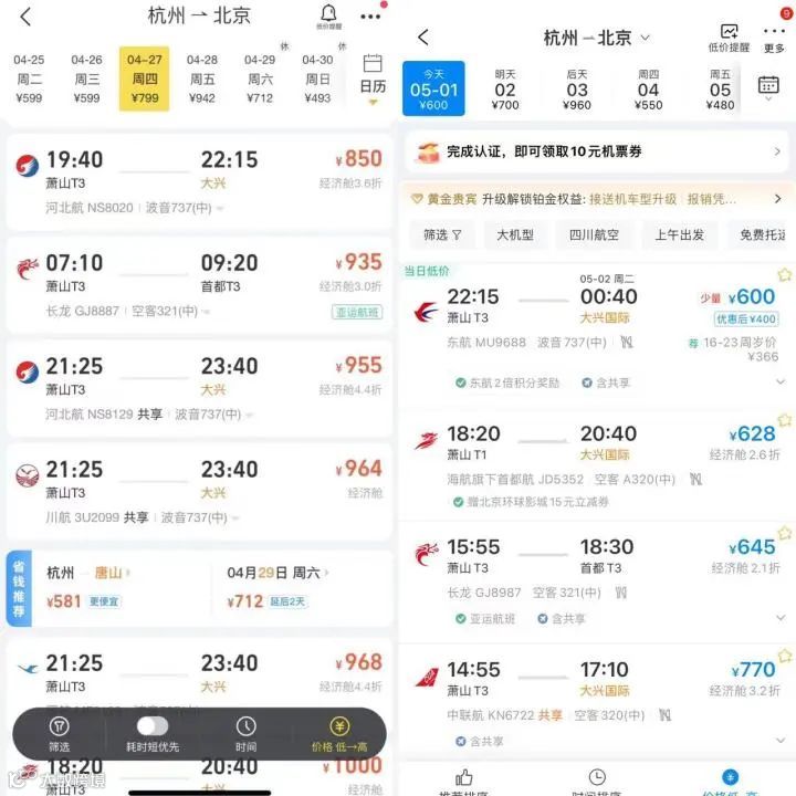 在相关平台上可以查到,不少机票从5月1日开始就出现了不同程度下降。杭州飞北京,5月1日,最低价为573元;杭州飞昆明,5月1日出发价格为600元。