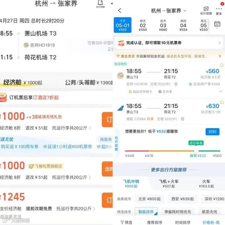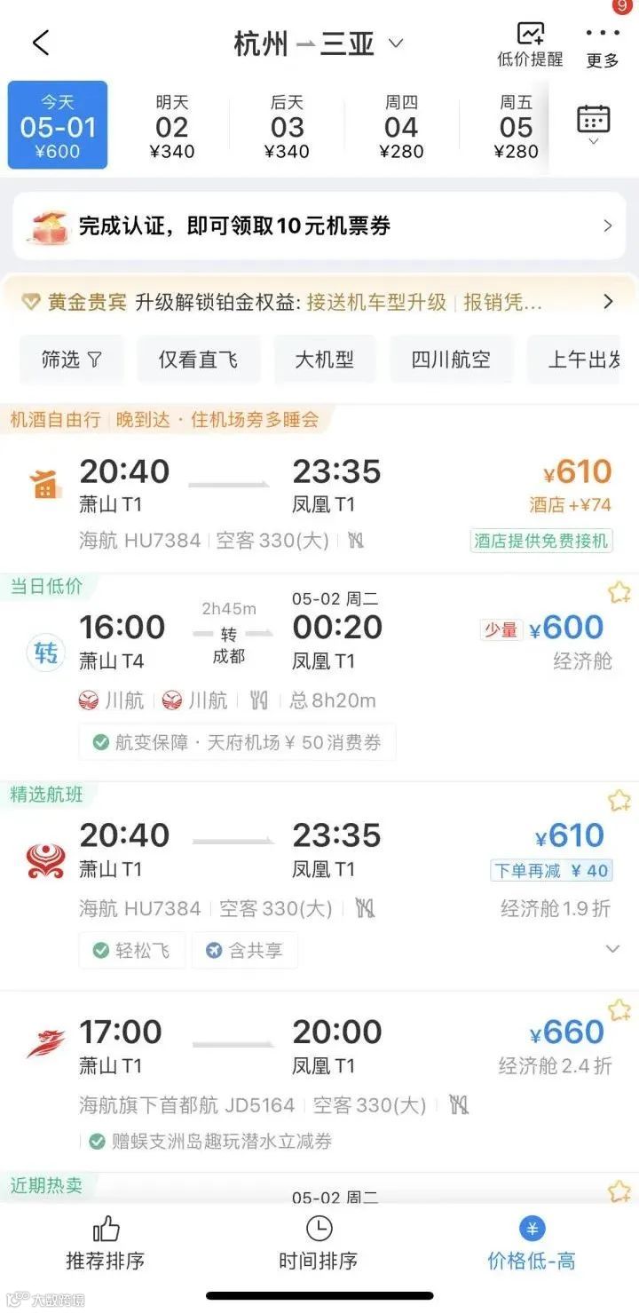 五一前,杭州飞三亚价格最低2800元,5月1日机票价格是600元,而到5月4日,杭州飞三亚居然只要280元。