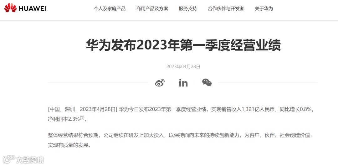 4月28日下午,华为今年一季度“成绩单”最新出炉:2023年第一季度华为共实现销售收入1321亿元人民币,同比增长0.8%,净利润率2.3%。