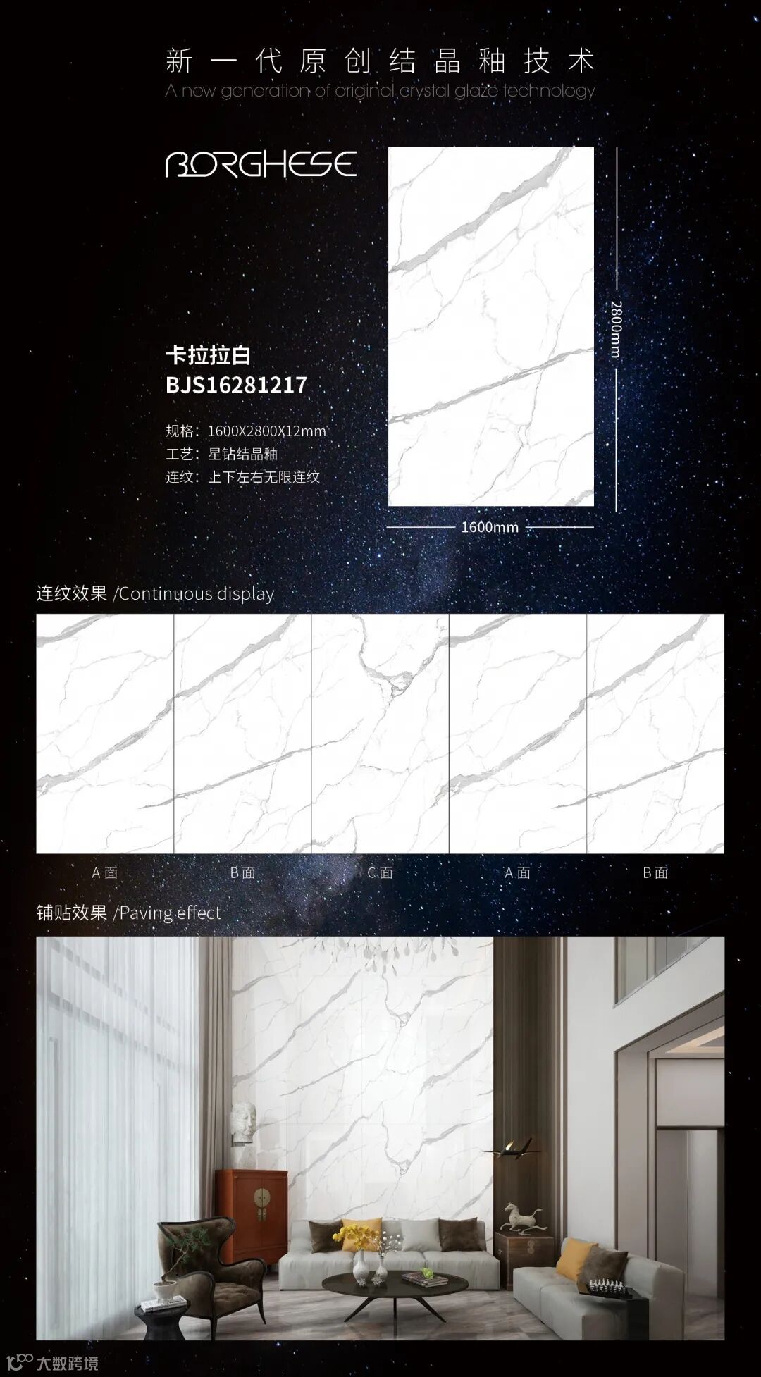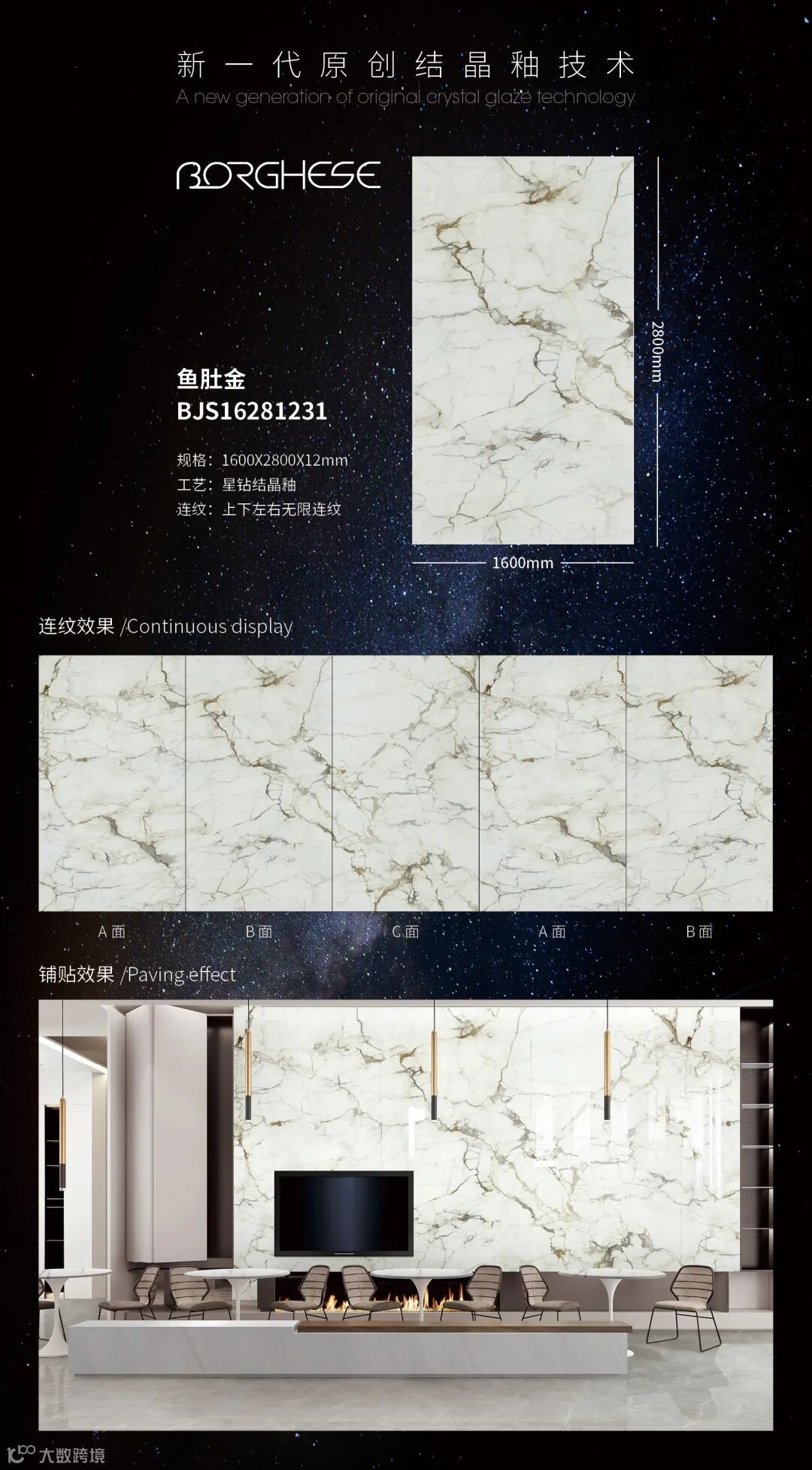 连纹有着其他单片产品无法媲美的魅力:纹理突破现有局限,延伸至更远、更多元,达到整体效果的完整性,带来大自然流动的生命力与艺术美感,营造更大气的空间氛围。连纹成为备受设计师青睐的品味之选,完整呈现天然石材的纹理,富有变化,高端大气。