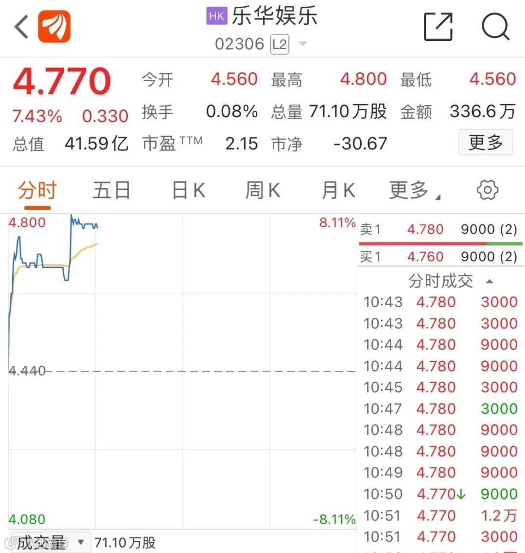 4月21日开盘,乐华娱乐一度涨超8%,截至券商中国发稿,乐华娱乐涨7.43%,报4.77港元/股。