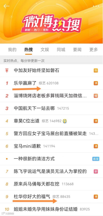 排名结果渐次揭晓后,不出意料,#乐华赢麻了#的话题迅速攀上热搜,并且,一度冲上热搜第一,热搜榜上甚至还出现了#杜华你好大的福气#的词条。