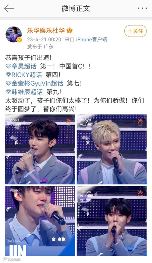 乐华娱乐(02306.HK)是在港上市的国内“艺人经纪第一股”。比赛结束后,乐华娱乐的创始人、董事长杜华也连夜在微博报喜:“孩子们你们太棒了!为你们骄傲!你们终于圆梦了,替你们高兴!”。