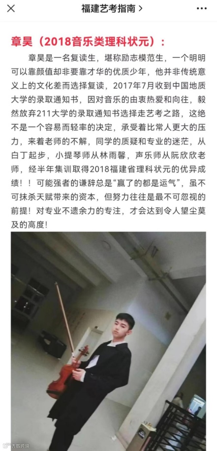 章昊,2000年生,福建人,曾为乐音乐梦想放弃211大学的录取通知书,复读艺考,2018年获得“理科类省艺考状元”,考进福建师范大学。