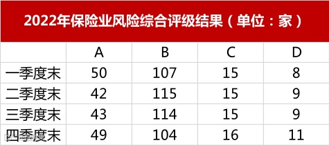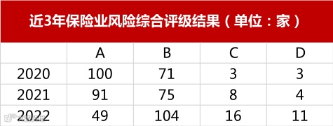 通报数据显示,截至2022年末,保险业风险综合评级结果为:风险小的A类公司49家,风险较小的B类公司104家;风险较大的C类公司(即中风险公司)16家;风险严重的D类公司(即高风险公司)11家。