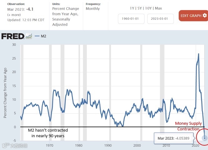 这也意味着,银行业危机后,美国货币供应量正以1930年大萧条以来最快速度收缩。