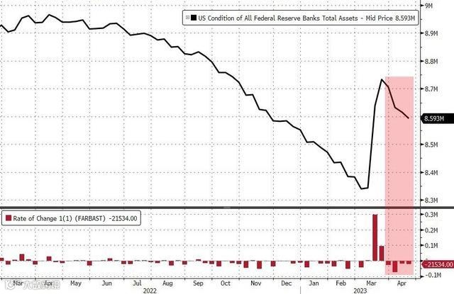 据美联储公布的数据显示,截至4月19日一周美联储的资产负债表规模环比前一周缩水215.34亿美元,连续缩水四周。截至4月5日当周,一周内缩减735.58亿美元,创2020年7月以来美联储资产负债表的最大单周降幅。