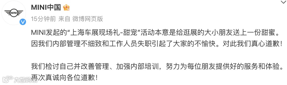 2023年4月20日14时左右,MINI中国发布微博称,MINI发起的“上海车展现场礼-甜宠”活动本意是给逛展的大小朋友送上一份甜蜜。因我们内部管理不细致和工作人员失职引起了大家的不愉快。对此我们真心道歉!我们检讨自己并改善管理、加强内部培训,努力为每位朋友提供好的服务和体验。再次真诚向各位道歉!