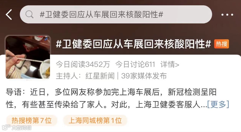 另外,五一长假临近,关于新冠二次感染的话题也持续引发热议。4月25日, 微博话题:#卫健委回应从车展回来核酸阳性#冲上热搜。近日,多位网友称,在参加完上海车展回来后,新冠检测呈阳性,有些甚至传染给了家人。对此,上海卫健委客服人员表示,从1月8日新冠病毒感染实施“乙类乙管”后就放开了,现在没有管控,具体的事情可以咨询车展管理部门。
