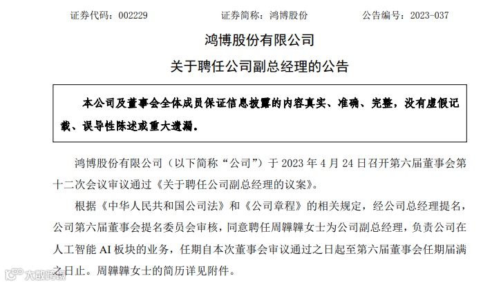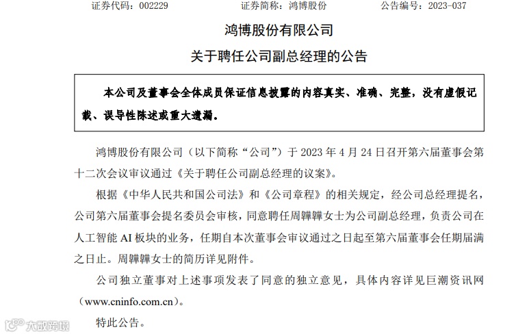 24日晚间,鸿博股份发布了一则公告:聘任周韡韡女士为公司副总经理,负责公司在人工智能AI板块的业务。
