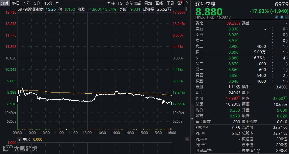 4月27日,珍酒李渡集团(简称“珍酒李渡”)在港交所主板挂牌上市,成为“港股白酒第一股”。不过,上市首日,珍酒李渡破发了,该股一开盘就大跌16.8%。截至收盘,该股跌17.93%报8.88港元/股,总市值为290亿港元。