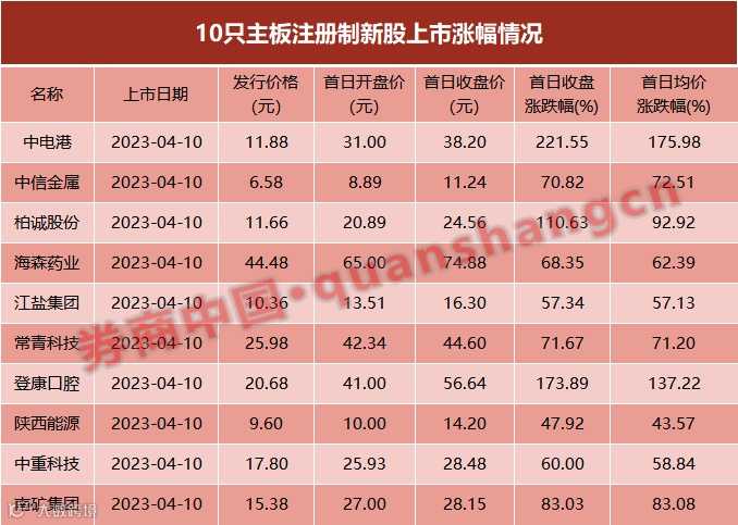 上周一上市首日,10只新股均实现较大涨幅。截至当日收盘,中电港涨幅高达221.55%,登康口腔涨幅为173.89%,柏诚股份涨幅为110.63%。其他新股首日涨幅也均超过44%,涨幅最小的陕西能源上涨47.92%。