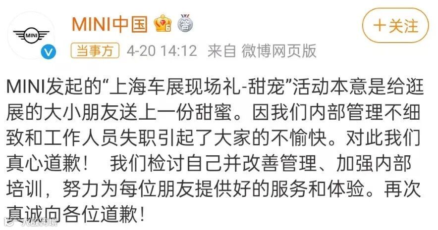 面对愈演愈烈的舆论危机,宝马MINI紧急发布道歉声明。其官方微博MINI中国回应:“MINI发起的‘上海车展现场礼-甜宠’活动本意是给逛展的大小朋友送上一份甜蜜。因我们内部管理不细致和工作人员失职引起了大家的不愉快。对此我们真心道歉!我们检讨自己并改善管理、加强内部培训,努力为每位朋友提供好的服务和体验。再次真诚向各位道歉!”