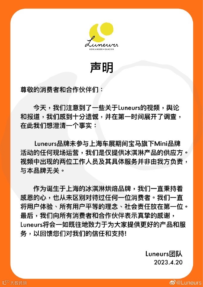 与此同时,涉事冰淇淋品牌Luneurs也紧急发声明称:“今天,我们注意到了一些关于Luneurs的视频,舆论和报道,我们感到十分遗憾,并在第一时间展开了调查,在此我们想澄清一个事实,Luneurs品牌未参与上海车展期间宝马旗下Mini品牌活动的任何现场运营,我们是仅提供冰淇淋产品的供应方。视频中出现的两位工作人员及其具体服务并非由我方负责,与本品牌无关。”