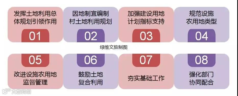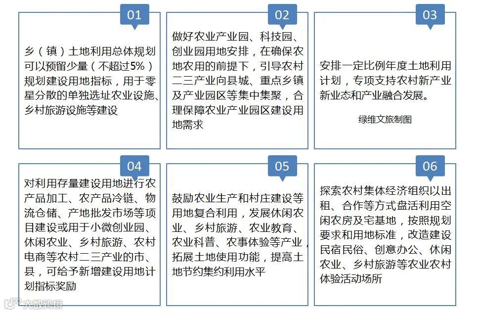 2017年12月,国土资源部、国家发展改革委联合印发的《关于深入推进农业供给侧结构性改革做好农村产业融合发展用地保障工作的通知》从八个方面明确了保障农村产业融合发展用地的政策。