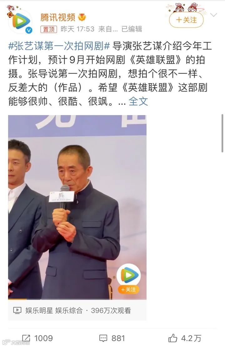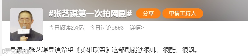 4月10日,#张艺谋第一次拍网剧#登上微博热搜。