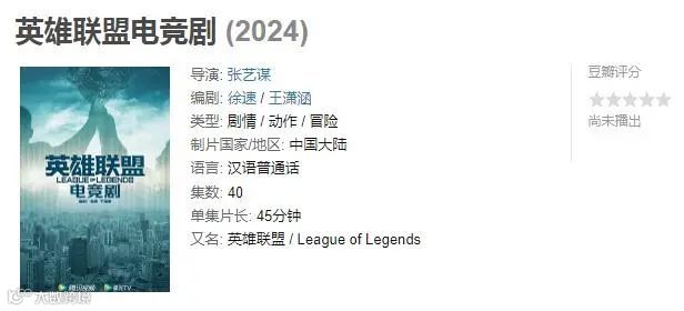 在此之前,耀客传媒已经公布即将开拍电竞题材网剧《英雄联盟》,张艺谋导演,徐速、王潇涵编剧,一共40集,每集45分钟,将在腾讯视频和极光TV播出。