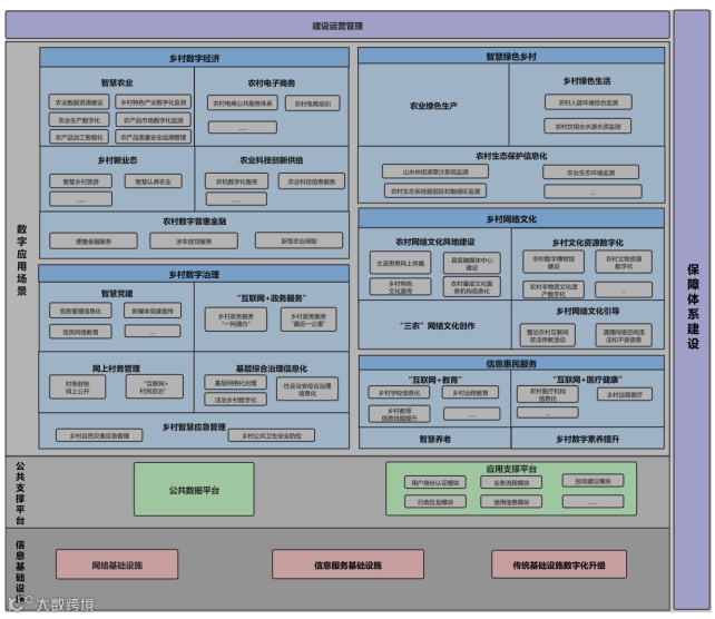 本指南根据《数字乡村发展战略纲要》的有关要求,结合国家数字乡村试点工作重点任务部署,提出了数字乡村建设的总体参考架构,具体包括信息基础设施、公共支撑平台、数字应用场景、建设运营管理和保障体系建设等内容。如图 1 所示。