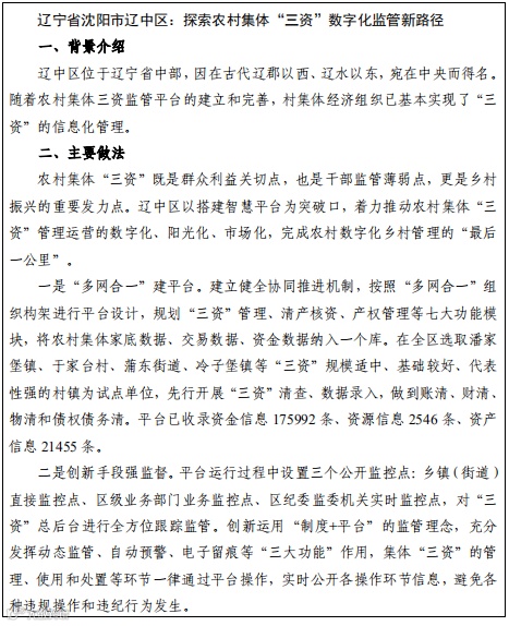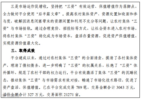省级层面开发建设农村集体“三资”管理服务平台,推动农村集体“三资”管理的制度化、规范化,实现农村集体“三资”的保值增值,防止农村集体“三资”流失,保障农民群众合法权益。