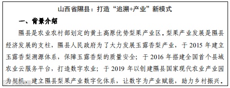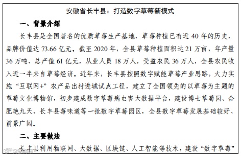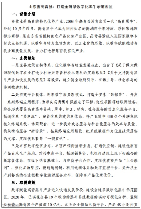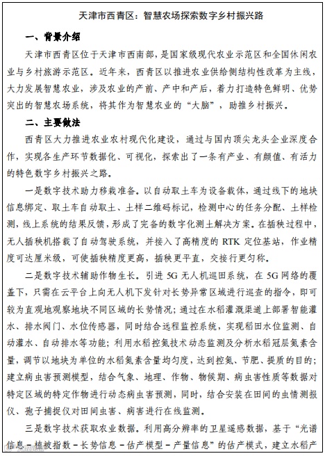 数字应用场景描述了农业农村生产生活各个领域与信 息化深度融合的适用情景,尝试划分了省、县两级政府和相关部门的职责定位,提出了建设应用场景应具备的资源禀 赋、资金、标准等基本条件,并提供了部分典型案例。各地方应结合自身发展实际,选择合适的应用场景参考使用。