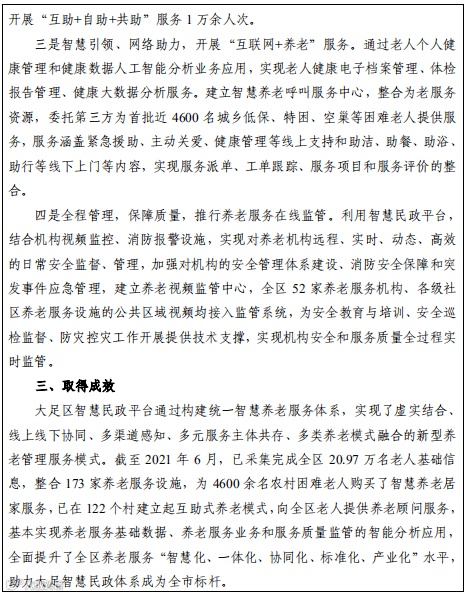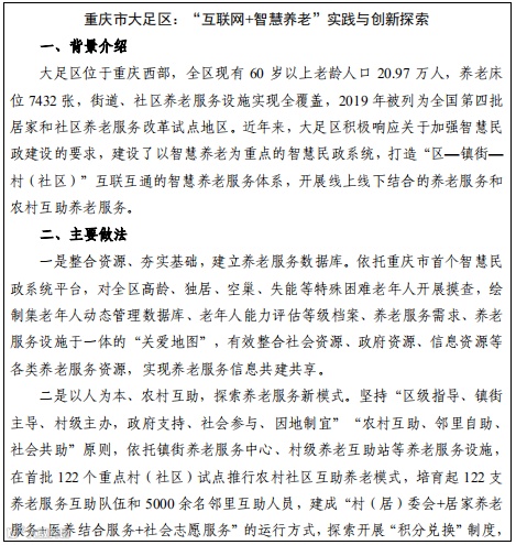 智慧养老是指利用智能穿戴设备、家居设备和呼叫设备等,为农村地区老年人提供远程医疗、健康管理、随身监护、关爱视频等综合性、多样性的养老服务,提升农村老年人生活质量。