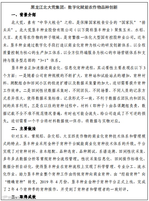 研究与推广商业化育种信息系统与设备的技术升级解决方案,探索表型+基因型的智能育种技术体系构建,引导种业龙头企业或产业联盟构建育繁推全产业链大数据平台,实现种业企业育种技术数字化。研究推广农作物品种适宜性精准评价模型和系统,推动审定品种适宜生态区精细到市县尺度,实现品种推广智能化、精准化。