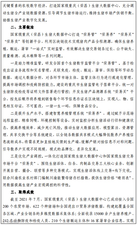 利用物联网、大数据、区块链等技术,对畜牧养殖过程进行全程监控,实现要素合理调配、养殖条件优化,提高监管能力,提升产品品质。依托畜牧养殖大数据监管平台,记录全环节畜牧养殖流转信息,形成环环相扣的信息链条,有效防范不法分子违规开具检疫证明、违规调运等问题。