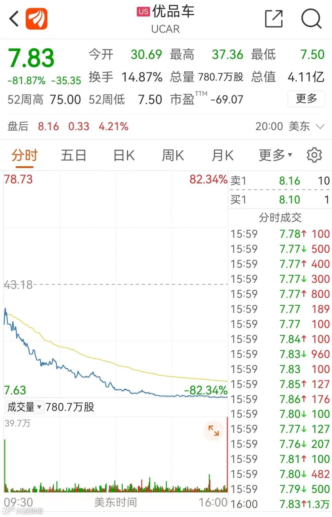 美股热门中概股普遍下跌,其中值得注意的是,上市第二日的新能源换电企业优品车暴跌81.87%,领跌中概股。而该股票在前一日(即上市首日)最高暴涨1128.33%,截至收盘涨约620%。