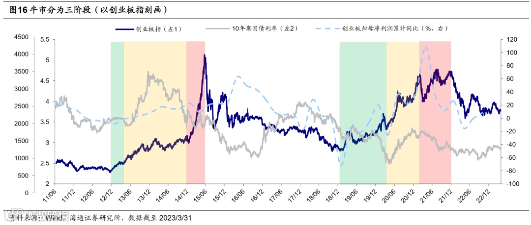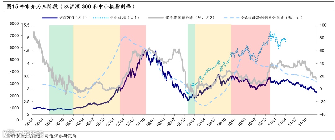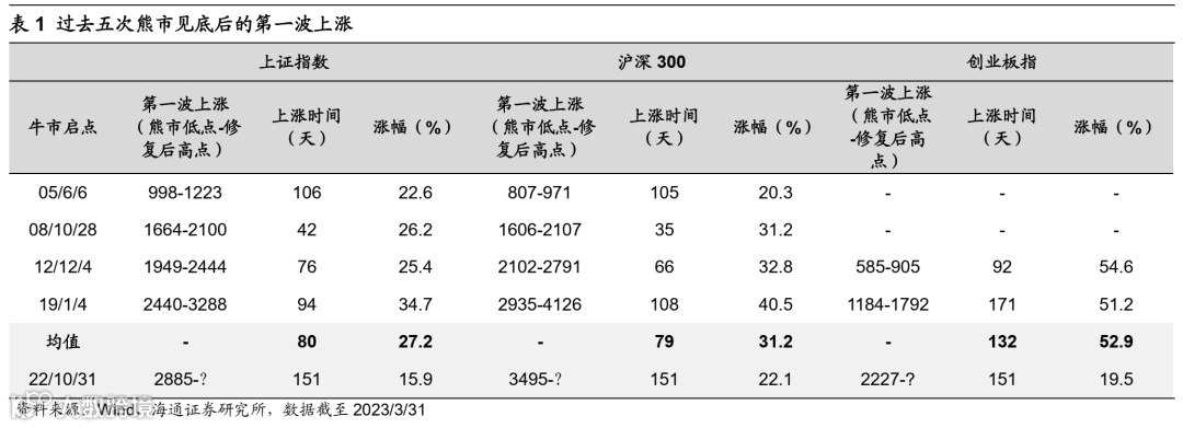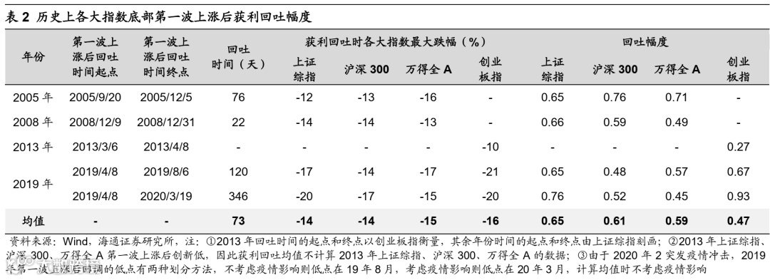 A股处在牛市初期,第一波上涨结束后或进入震荡蓄势阶段。我们分析过,牛市可以分为三个阶段:第一阶段孕育准备期,第二阶段全面爆发期,第三阶段泡沫疯狂期。去年10月底以来的上涨属于牛市的孕育准备期,这一阶段基本面还未明显改善,市场的上涨主要源自政策宽松和悲观预期修复。回顾此前四轮牛市初期的第一波上涨,上涨时间持续3-4个月,宽基指数涨幅约25%-30%;2022年10月至今A股第一波上涨持续近5个月,上证指数最大涨幅16%、沪深300最大涨幅22%。历次熊市见底后第一波上涨行情走完,市场往往会获利回吐,背后的原因是基本面还不够扎实。历次回吐过程中上证指数平均下跌46天(剔除2019年),上证指数、沪深300、万得全A平均回撤13%左右、回吐前期上涨行情0.5-0.7左右的涨幅,详见下表。我们认为,本轮行情结束后的第一次回调的扰动因素主要来自海外,部分国家的债务风险或将暴露;此外,还需持续关注国内宏微观基本面的验证情况。但总的来看,从经济周期和股市周期来看,2022年10月底是A股熊转牛的转折点,我们认为短暂回调不改牛市格局,修整蓄势期也是牛市主升浪的布局区。