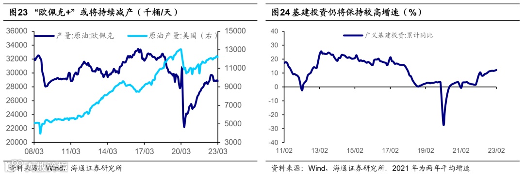 原油价格或延续震荡格局。从需求端看,高利率环境下海外需求回落,中国经济修复斜率或将放缓,对原油的需求短期难有明显改善。从供给端看,在维持之前的原油减产协议不变的前提下,4月2日“欧佩克+”又宣布从5月起至2023年底自愿削减产量,包括沙特阿拉伯、俄罗斯、伊拉克、阿联酋等国纷纷宣布减产计划,总计减产量高达165万桶/日。受供需两端均走弱影响,二季度原油价格或继续震荡。