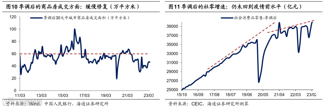 下一阶段,经济修复斜率或有可能放缓。从外需看,海外通胀压力导致货币收紧,高利率压制需求,且叠加欧美银行业动荡冲击,海外主要经济体3月PMI均有回落,海外需求降温或进一步拖累出口。从内需看,一方面,一季度地产销售的回暖或只是短期现象,市场信心仍未修复,所以当前土地交易仍在低位,地产基本面企稳或需要更长时间。另一方面,消费并没有报复性反弹, 1-2月的社零增速仅有3.5%,消费增速较疫情前下了台阶。进入二季度,随着居民的收入预期有所修复,消费需求或将持续释放,叠加去年同期的低基数效应,预计二季度社零增速明显回升。但收入增长预期偏弱、超额储蓄不足且结构分化,居民消费释放的高度或相对有限。从当前跟踪的高频数据来看,截至3月底,生产、消费等多项高频指标的环比增速均在放缓,但是由于基数的走低,同比读数走高。
