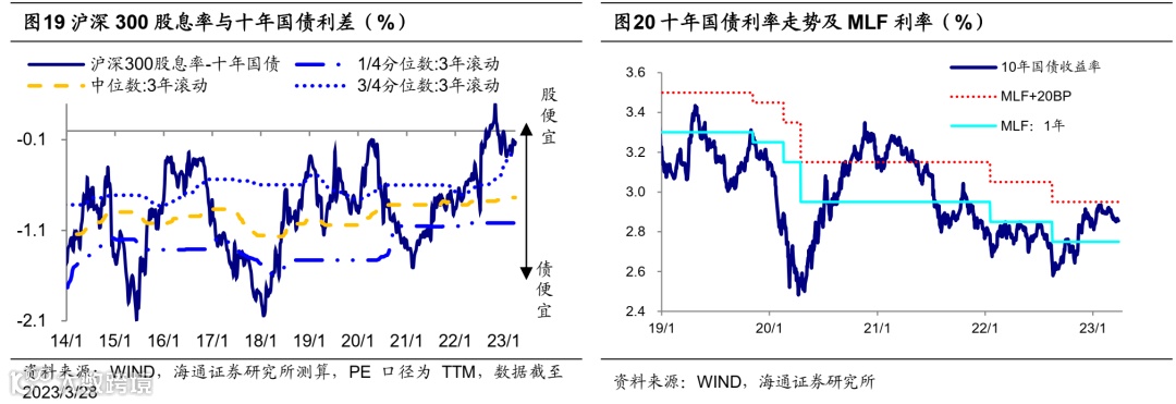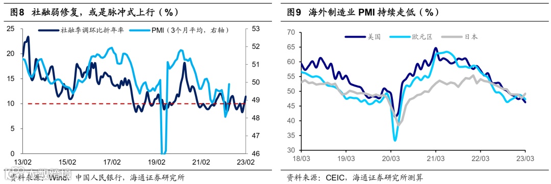 国内1、2月经济强劲复苏,3月经济修复斜率趋缓。随着疫情对经济的影响逐步消退,2023年1-2月宏观经济运行已呈现回升态势,消费、地产数据明显改善,基建和制造业投资保持较高增速,但由于海外通胀高企、需求持续降温,出口仍有下行压力。进入3月,国内经济复苏斜率有所放缓。3月制造业PMI为51.9%,仍处于荣枯线上,反映经济复苏仍在继续;但PMI较2月下降0.7个百分点,逆季节性回落也反映经济恢复基础仍不稳固。消费继续修复,但结构有所分化,线下餐饮、娱乐消费仍在修复,但3月汽车零售同比、家电线上线下销售额同比仍在负值区间。出口方面,海外主要经济体PMI指数均有明显回落,3月欧元区制造业PMI下降至47.3,美国制造业PMI下降至46.3,海外需求或延续降温趋势,我国出口依然有下行压力。总体来看,相比于1、2月的高斜率修复,3月以来国内供需两端修复有所放缓。