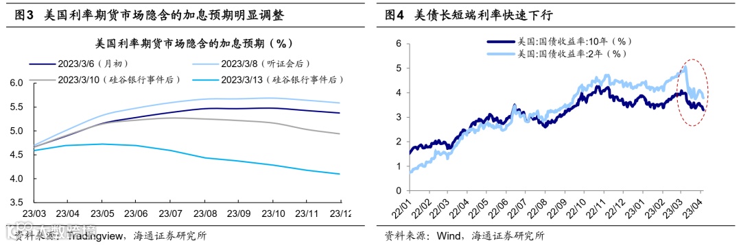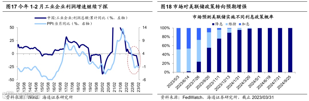 海外在银行业风险事件影响下,美联储加息预期放缓。随着能源价格回落以及全球供应链状态恢复到正常水平,今年1-2月美国CPI同比继续回落;但美国租金通胀仍未见顶以及劳动力市场依然紧张,美国核心通胀压力不减,2月核心CPI环比上行0.1个百分点至0.5%,为2022年9月以来高点。但在高利率环境下银行系统流动性压力逐渐显现,3月以来硅谷银行、瑞士信贷等海外金融机构发生风险事件。风险事件发生后各国政府反应迅速,注入流动性以稳定市场预期,目前尚未演变成为系统性危机;但由于这些风险事件加大了市场波动,对金融危机和经济衰退的担忧也使得美联储加息预期放缓。3月美联储加息25BP,相较2月市场预期有所松动,并在声明中删去“持续加息”的表述,表明美联储加息或已近尾声。截至23/04/05,根据FedWatch数据,市场预计5月美联储停止加息的概率为58%,加息25BP的概率为42%。