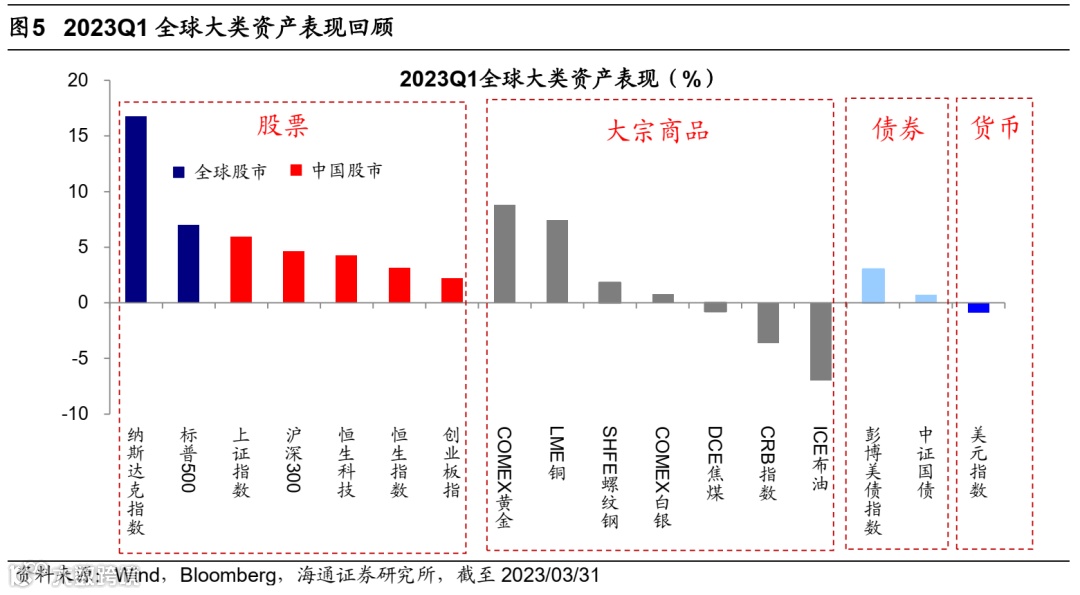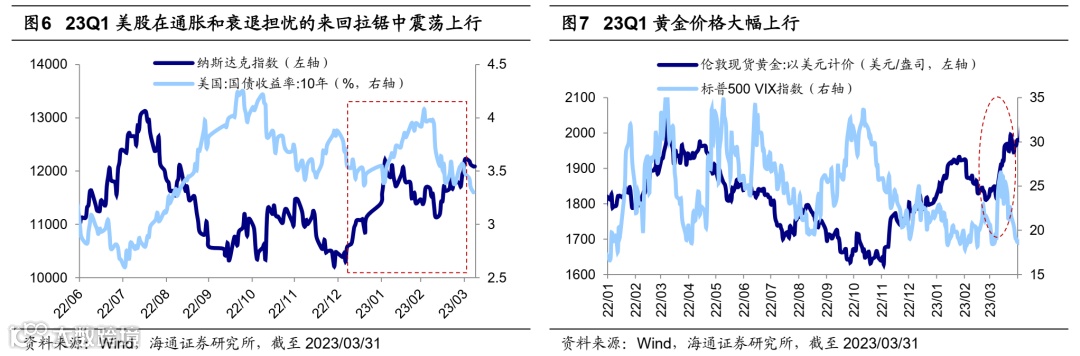 2023Q1大类资产表现:权益和避险资产表现较优,其他大宗商品表现较弱。具体来看,2023年一季度海外银行业风险事件发酵使得市场对经济衰退的担忧升温,美联储加息预期明显放缓,推升了黄金的价格,2023Q1中COMEX黄金涨9%。美欧经济仍在下行趋势中,且在银行业风险事件发生后,市场加深了对美欧经济衰退和大宗商品需求不振的担忧,今年一季度ICE布油跌7%、CRB指数跌4%。