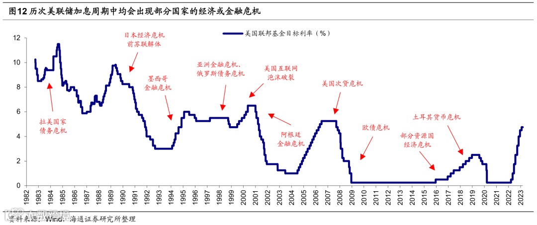 海外扰动:二季度需担忧美联储紧缩“后遗症”,部分国家债务风险可能暴露。我们还需分析美欧经济及国际局势,作为大类资产配置的辅助。当前海外仍处在美联储加息周期中,历史上美联储6轮加息周期都爆发了经济或金融危机,原因在于美债利率是全球金融资产的“锚”,美联储加息往往触发高杠杆国家或机构的危机。例如第1轮加息周期(1983-1984年)爆发了拉美国家债务危机;第2轮加息周期(1988-1989年)日本跟随式加息导致其国内房地产和股市的崩盘;第3轮加息周期(1994-1995年)引发了亚洲金融危机;第4轮加息周期(1999-2000年)美国互联网泡沫破灭,美国经济走向衰退;第5轮加息周期(2004-2006年)美联储加息刺破房地产泡沫,次贷危机最终升级成全球金融危机,也为欧债危机埋下祸根;第6轮加息周期(2015-2018年)土耳其发生货币危机。