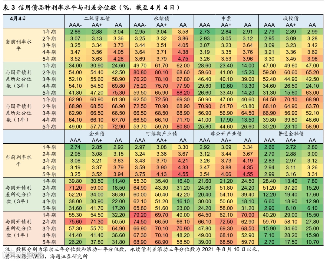 二季度基本面的预期差不大。我们认为Q2债市10Y国债利率区间或在2.75%~2.95%,基本面修复放缓、信贷开门红逐渐度过,欠配行情仍在演绎,但债市情绪逐渐转热、杠杆久期策略逐渐拥挤,建议控制3-4年国股二永、5-10Y利率债的交易节奏,票息策略为主。