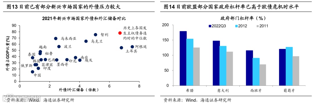 未来部分新兴市场国家、欧元区部分高杠杆国家以及日本的债务风险值得警惕。这次美联储激进加息下,硅谷银行、瑞信等海外金融机构已发生风险事件。目前来看,海外银行业演变成系统性金融危机的概率还相对较低,但在全球高利率环境下,海外风险因素或已在悄然间持续累积,我们认为还需警惕来自其他海外国家的风险事件冲击,如新兴市场国家、欧洲以及日本。根据IMF统计,目前新兴市场有约2370亿美元的外债面临违约风险,25%的新兴市场国家接近债务困境,未来土耳其、阿根廷、智利等新兴市场国家的主权债务风险存在愈演愈烈的可能。在目前欧洲弱经济、高通胀、紧货币的宏观环境下,欧元区部分高杠杆国家的主权债务或同样存在隐忧,如希腊等。日本方面,若未来当地迫于通胀压力放弃YCC政策,利率上升后日本政府的账面亏损和偿债成本将显著增加,届时叠加羸弱的经济基本面,由此引发的日本债务危机也存在波及全球的可能,若二季度以上海外国家债务风险暴露,或对二季度市场行情形成扰动。