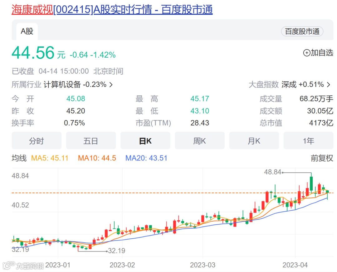 二级市场上,海康威视近一周股价下跌2.24%,今年以来则整体呈现反弹走势,年内已涨逾28%,现价44.56元/股,总市值约4173亿元。