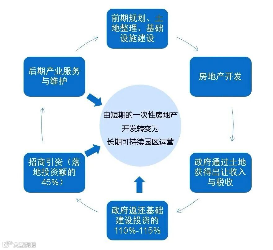 在产业新城开发与运营中,华夏幸福充分发挥产业平台的优势,整合各方产业资源,对接地方政府,除了一二级开发外,更为政府提供以产业规划、服务与导入方面的服务。通过一系列的操作,从前期开发及后续运营的方面受益均等获得,成功把短期的一次性房地产开发转变成长期且可持续的园区运营。