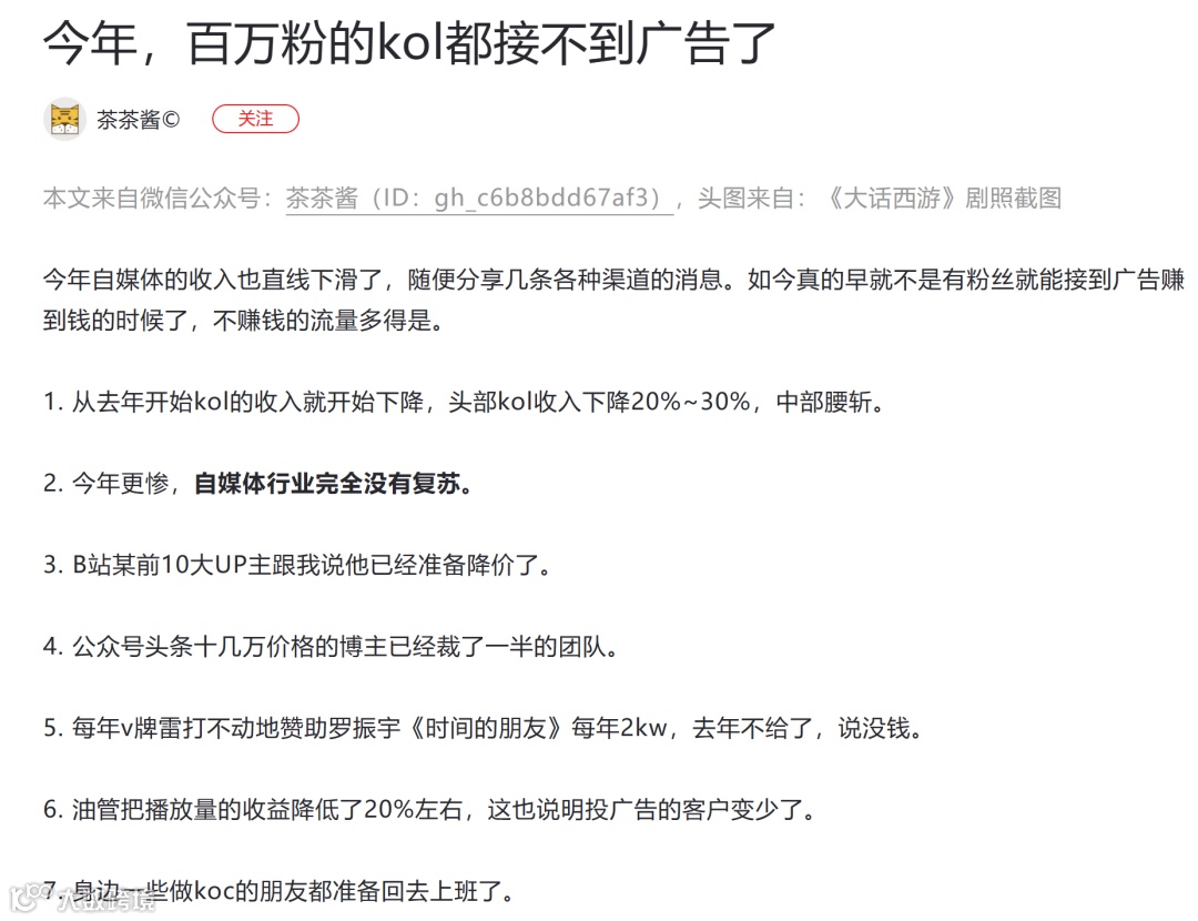 值得一提的是,不仅是B站up主的“停更潮”,知名自媒体人“姜茶茶”近日在小号发了一篇名为《今年,百万粉的KOL都接不到广告了》的文章也引发关注。