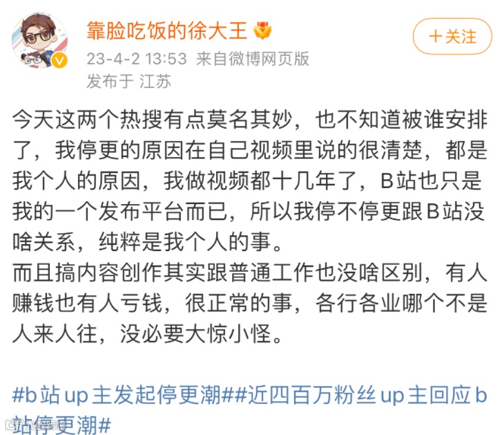 在此背景下,这也让B站up主“停更潮”冲上热搜第一。截至目前,B站未对上述消息作出回应。但在B站的up主进行了回应。4月2日下午,@靠脸吃饭的徐大王微博发文称“今天的热搜有点莫名其妙”,他表示自己停更属于个人原因,做视频已经十几年,B站也只是自己的一个发布平台而已,停不停更与B站无关。