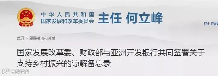 国家发展改革委主任何立峰、财政部部长刘昆与亚洲开发银行行长中尾武彦签署了《中华人民共和国国家发展和改革委员会 财政部与亚洲开发银行关于支持中华人民共和国乡村振兴的谅解备忘录》。