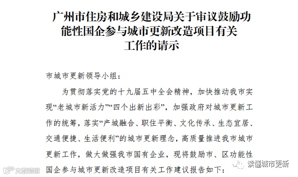 近日,一份名为《广州市住房和城乡建设局关于审议鼓励功能性国企参与城市更新改造项目有关工作的请示》的文件流出,文件中心思想:鼓励市、区国企参与旧村改造。