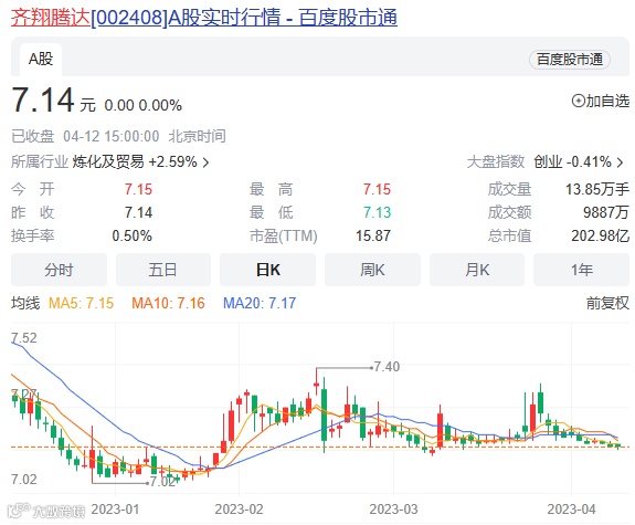 目前,齐翔腾达最新股价为7.14元/股,市值为203亿元。该公司今年1月份曾发布业绩预告,预计2022年度净利为5.98亿元至8.37亿元,比上年同期下降65%-75%。