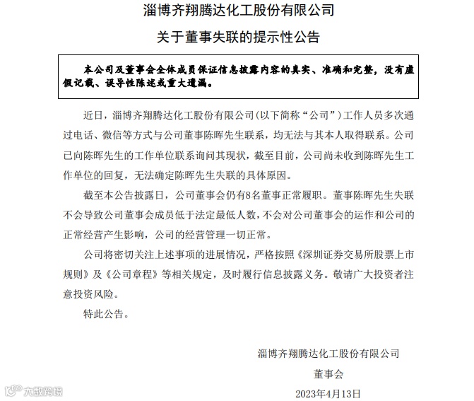 4月12日晚间,齐翔腾达发布公告称,公司工作人员多次通过电话、微信等方式与公司董事陈晖联系,均无法与其本人取得联系。