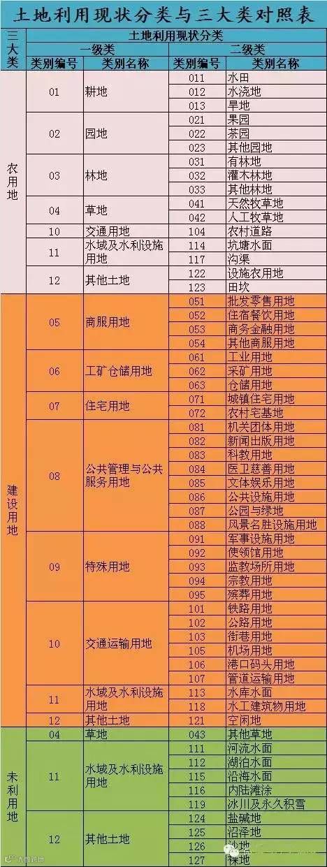 《土地利用现状分类》国家标准采用一级、二级两个层次的分类体系,共分12个一级类、57个二级类。其中一级类包括:耕地、园地、林地、草地、商服用地、工矿仓储用地、住宅用地、公共管理与公共服务用地、特殊用地、交通运输用地、水域及水利设施用地、其他土地。《中华人民共和国土地管理法》与《土地利用现状分类》中类别的对照关系: