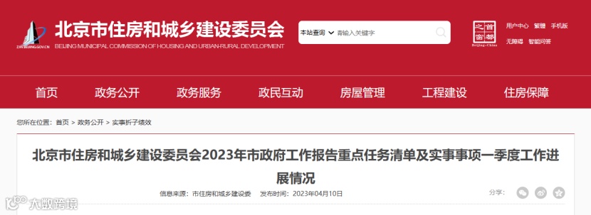 4月10日,北京市住建委公布了2023年市政府工作报告重点任务清单及实事事项一季度工作进展情况。