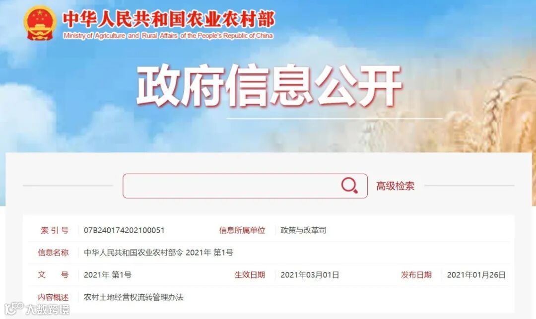 《农村土地经营权流转管理办法》已经农业农村部2021年第1次常务会议审议通过,现予发布,自2021年3月1日起施行。