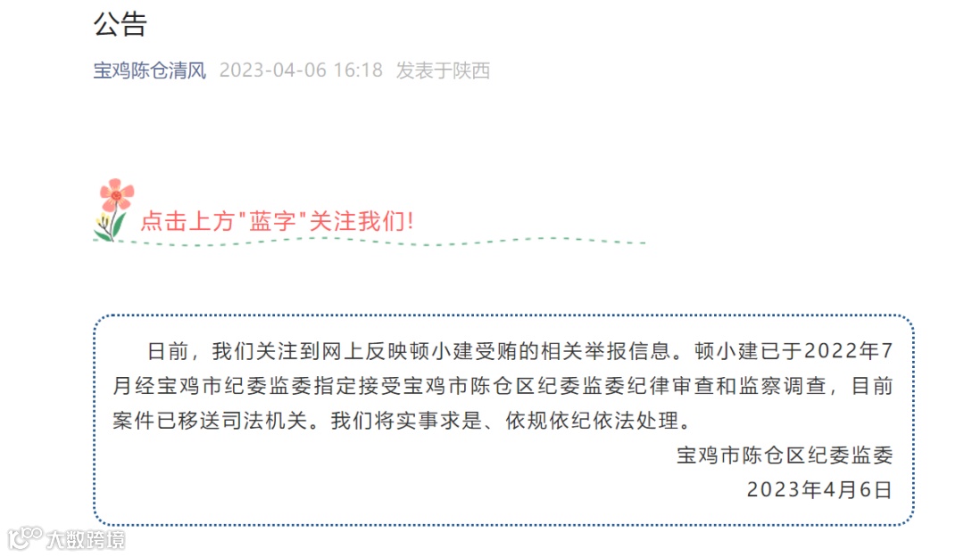 宝鸡市陈仓区纪委监委今日发布通告:日前,我们关注到网上反映顿小建受贿的相关举报信息。顿小建已于2022年7月经宝鸡市纪委监委指定接受宝鸡市陈仓区纪委监委纪律审查和监察调查,目前案件已移送司法机关。我们将实事求是、依规依纪依法处理。